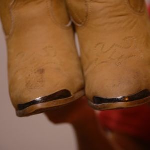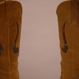 Tan color western style leather boots. Gorgeous side carving embedded with beautiful colored feathers. Stacked 3" inch heels, metal toe embellishment. These boots are pre-loved with minor wear, minor stains, but still very fashionable and comfy too. Leather upper, balance man made materials. Size 6-1/2 true to fit