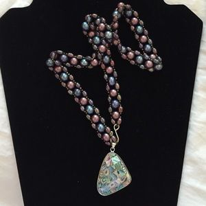 All from the sea.... You can almost hear the waves crash around you! May also be worn as a scarf that's hangs to the side.... Very versatile. You choose how to wear this stunning piece measures 21" from tip of abalone to beginning of clasp! 20" of pearls.