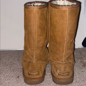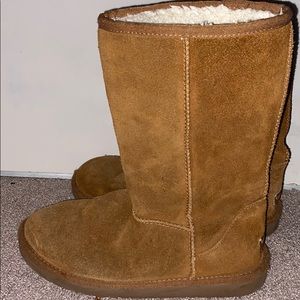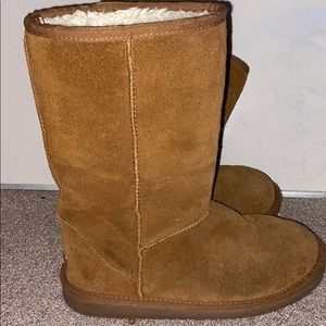 They are brown ugg boots that are a size 4 in kids but I’m a 6 or 6.5 in woman’s and can fit into them 🙂 they are in good shape only worn 3 times!