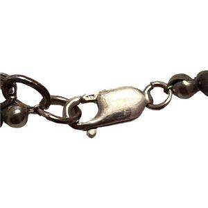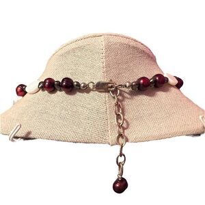 Gorgeous dark red freshwater pearls and mother of pearl sterling silver necklace. There are smaller gray pearls in between the bigger beads. Length is 18”-20”.