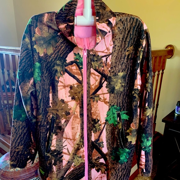 This is so unique and beautiful! On one side it has a vivid, brushed material, RealTree print, and it fully reverses to a solid pink nylon. You can flip your coat as the temperatures fluctuate! Either way, it fully zips and has two front slash pockets. It measures 22 inches, underarm to underarm, and is 29 inches long. It’s in excellent condition with no flaws.