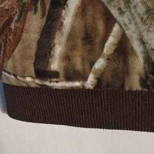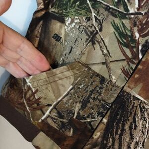 This green and brown RealTree camo full zip hooded jacket is a boy's size Small (3-6) with a pit to pit measuring 11" laying flat and a length of 11". It has two front pockets. Quilted lining. Shell: 100% cotton, Lining: 100% polyester and machine washable. In excellent pre-loved condition.