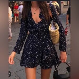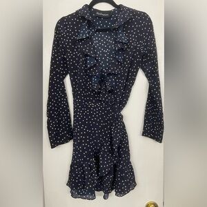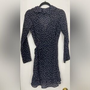 Elegant navy dress with white stars. Features ruffle details and wrap design. Perfect for any occasion.