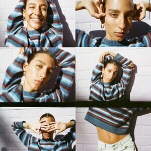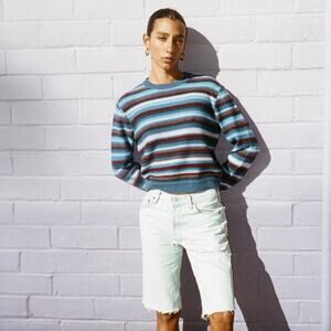 Realisation Ani Striped Cashmere Wool Crewneck Knit Sweater Top Gemstone Blue