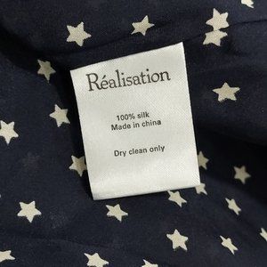 Dress from Realisation in Navy Star. The Ozzie dress is a star printed silk sundress that exudes sexy Parisian style without feeling too undressed and staying true to Realisation's wear anywhere, anytime aesthetic. Featuring a whimsical star print and feminine ruched sleeve. Flattering v-neck and empire waist that opens to a flirty skirt in classic a fit and flare silhouette. 100% Silk. Lined through skirt, unlined at bust and has sheerness. Zip back. Size Small. Currently style, retail $170.