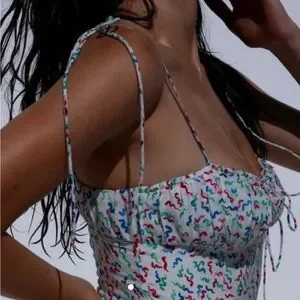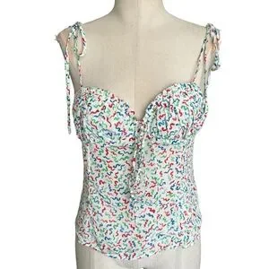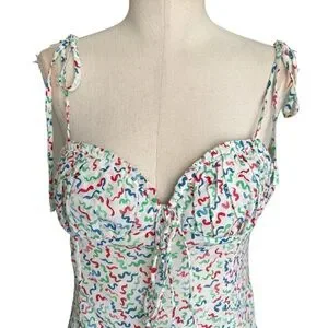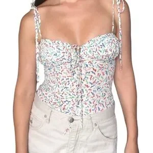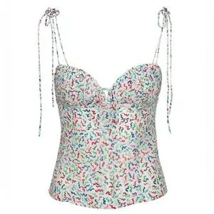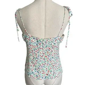 Chic tank top with colorful abstract pattern. Features tie straps and a fitted design. Perfect for casual outings.