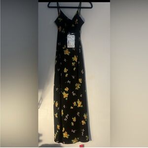 Elegant black dress with yellow and white floral print. Spaghetti straps. Flowy silhouette.