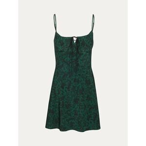 Realisation Par The Inez Dazed Noir Dress in size XS in very good condition. Milkmaid style, mini dress Fitted bodice Tie string detail at chest Firm elasticised gathered detailing on back A-line shaped skirt Adjustable straps Invisible zipper at the side No lining No need to wear a bra Original 'Dazed Noir' paisley style print, designed by Realisation Our Dazed Noir print is a green base with black and navy paisley pattern Sizing is considered standard, however if you are between sizes we would recommend sizing up Fabric: 100% Silk Crepe - Silk CDC is a densely woven silk, with a light lustre to the surface, and varies in sheerness depending on the base colour and fabric weight.