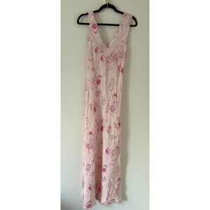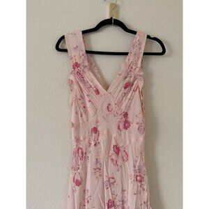 Realisation Women's Par Ivy Silk Crepe Maxi Dress In Eden Floral Pink Size Small. Great condition however it does have the blue stain in the front I thought it was part of the design but sadly it is not. Relaxed fit with biased cut skirt. Ankle length waisted slip dress. I have not tried any spot treating. Length 58in, pit to pit 19in.