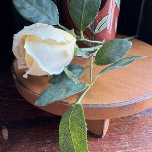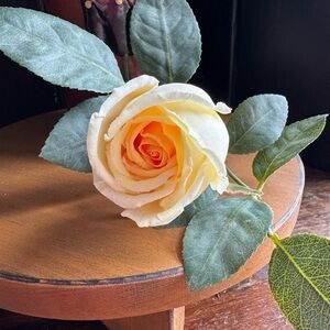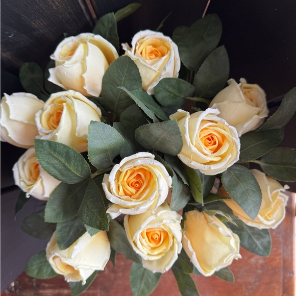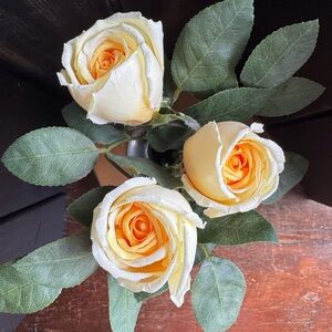 Glorious yellow roses are so realistic with their petal edges delicately curled—each feels real leaf is wired for perfect placement—realistic stems are wired and even the cuts on bottom look real, luckily there are no thorns.