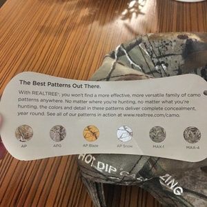 This listing is for a brand new Realtree AP camo cap with an adjustable strap. The back of the hat reads "hot dip galvanizing" in white letters. One size fits all. All items come from a smoke and pet free environment.
