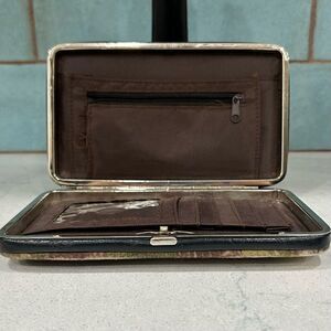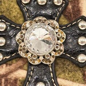 Measuring 7.5” x 4.5”, this wallet features a camouflage print adorned with bling accents. It is studded with metallic details and showcases a prominent Western cross on the front with flower rhinestones center, blending rustic charm with contemporary design. The exterior has a flap pocket and the interior is well-organized, offering ample space for bills, cards, and coins.