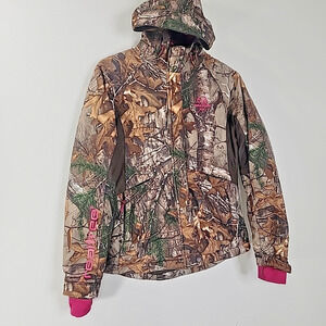 Features: Full zip front, hood, pink accents/logo, outdoor/hunting style.