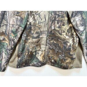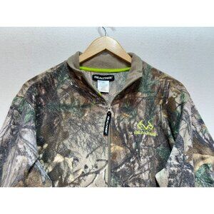 This Realtree camouflage fleece jacket in a medium size is designed for outdoor enthusiasts. Crafted from soft polyester material, it features a full-zip front and the iconic Realtree logo embroidery. A comfortable and functional choice for layering during cooler weather, blending seamlessly with nature.