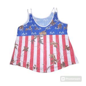 Women's Real Tree Patriotic american flag stars and stripes and leaf print tank top. New with tags, but has some dust/dirt on the strap from being in a retail environment, as shown in photo. Women's size XXL, real measurements shown in photos with top laid flat: