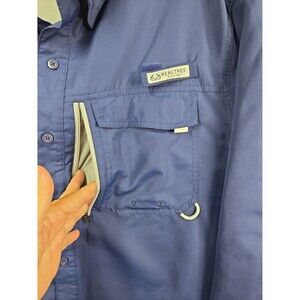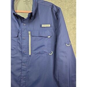 Realtree vented fishing shirt. Navy blue, long sleeve, button front with 2 chest pockets and a zipper pocket. Men's size XL. Good pre-owned condition. There is a very small snag on the back bottom left side of the shirt. Please see the last pic. Non-smoking home.
