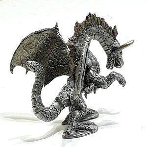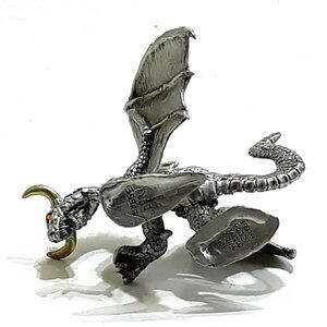 A majestic pewter dragon from Iron Wind Metals, featuring gold-tipped horns and intricate details. Perfect for collectors and fantasy enthusiasts, this rare piece brings mythical allure to any space.