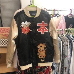 Stylish bomber jacket by Reason. Features bold embroidery on front. Black body with cream sleeves. Perfect for casual wear.