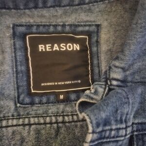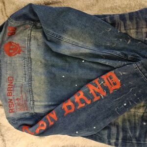 Stylish blue denim jacket featuring bold red lettering on the sleeve. Perfect for casual wear.