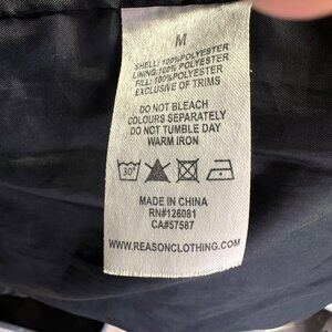Upgrade your wardrobe with the stylish Reason Brand Men's Hoodie Jacket. Featuring a black and gray design, zip-up front, drawstring hood, and "Reason" sleeve print. Perfect for any casual outing.