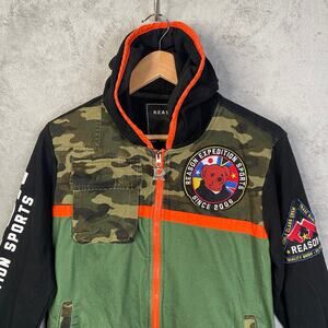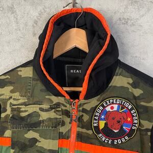 Eye-catching hoodie jacket showcasing a unique blend of urban style and outdoor inspiration. This standout piece features a camo and green color block design, complemented by black sleeves and orange accents. The jacket is adorned with bold patches and graphics, including a 'Reason Expedition Sports' sleeve print and a distinctive bear logo, adding an element of playful edginess. Complete with a full zip closure and a comfortable hood, this jacket is perfect for casual outings, streetwear fashion, or adding a statement layer to your everyday wardrobe.