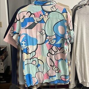 Vibrant graphic design. Short sleeves. Button-down style. Perfect for casual outings.
