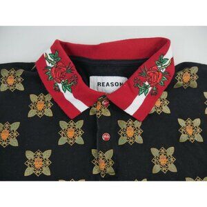 Reason NYC Long Sleeve Black Polo Shirt Facial Floral Pattern Print Mens Large