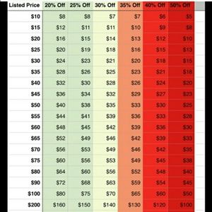 If item price is not $15 or less, on sale, or stated that the price is firm, I will probably accept offers in the green. Yellow offers depend on how long the item's been listed. Offer in the red and you will be blocked and unfollowed. Offer less than red you will be reported to Poshmark. We are all adults. Be respectful. My closet, my rules. Credit to @gretchen42 for the fab chart! ๐ Reposting is welcome as long as you credit the creator @gretchen42
