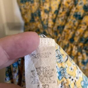 Yellow floral dress with blue and white flowers, short sleeves, and a gathered waist. Medium size. Hand wash with cold water, do not bleach. Made of lightweight material.