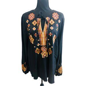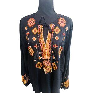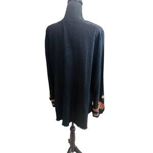 Elegant black tunic with intricate orange embroidery. Long sleeves with detailed patterns. Perfect for casual or dressy occasions.