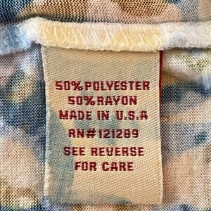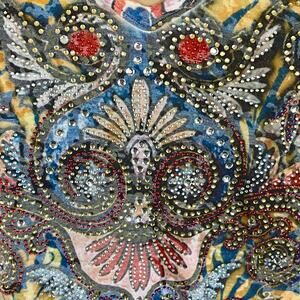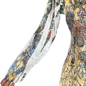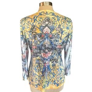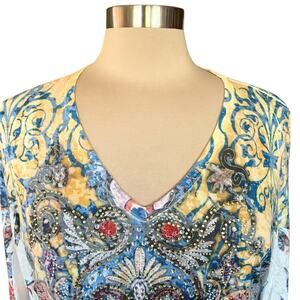 Reba Bling Rhinestone Embellished T-shirt Size LARGE Casual Western Boho Cowgirl. Yellow and blue colorway. Elaborate scroll design. Three-quarter length sleeves. Some slight wash wear.