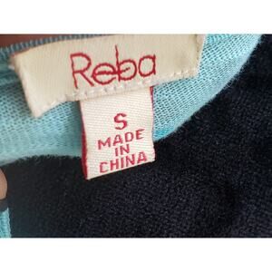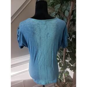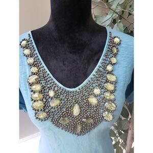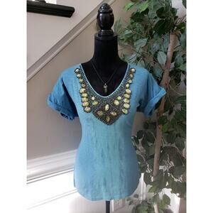 Reba Blouse Top Women's Small Blue Stretch Embellished Short Sleeve Deep V Neck