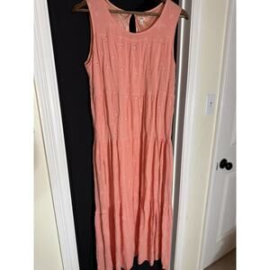 This is a Reba sleeveless tiered maxi dress in a lovely pink color, perfect for summer. The dress features an eyelet design with layered accents, giving it a country western theme. It is designed for women in size L, with a regular fit and a long dress length, making it a stylish choice for summer occasions.