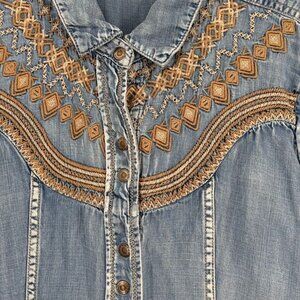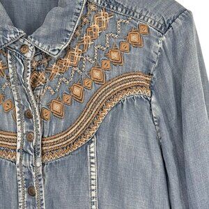 Reba Denim Embroidered Western Shirt Dress size Medium Tencel Snap Button
