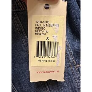 Stylish and rare Reba “Fall in Memphis” indigo denim jacket. Features western-inspired embroidery, rhinestone accents, and floral concho-style buttons. Button-front with decorative front pockets and stunning stitched back design. Includes original tags, MSRP $158, and extra replacement button.