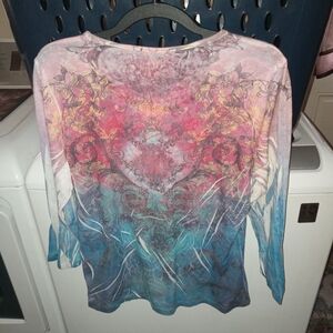 Elegant blouse with vibrant multicolor pattern. Features intricate studded accents. Ideal for a stylish look.