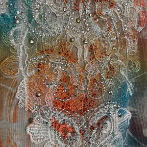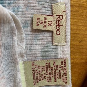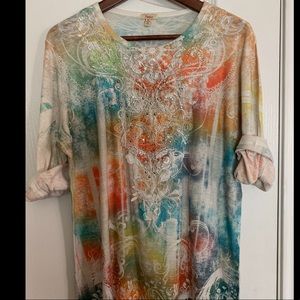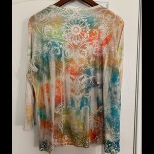 This top is a polyester and rayon blend, super soft and comfortable. It has red and clear crystals and silver embellishments on the front. Very lightweight. 26” long, sized at 1X, fits XL nicely. Very good condition.