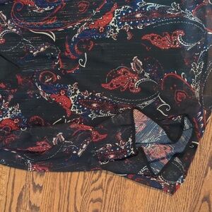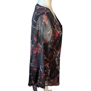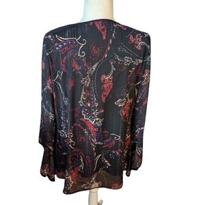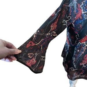 Reba Sheer flowy long bell sleeves black paisley scrolls v neck tunic Top Sz M
