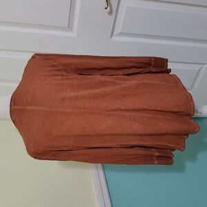 Terracota feminine top with lace accents on front. Button-down front with metal buttons. Lon sleeves with trim accent on the cuffs. Fitted silhouette. Rounded bottom hem. Shell is 60% cotton and 40% rayon, woven panel 100% rayon and trim is 90% cotton and 10% polyester.
