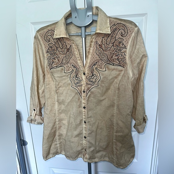 Elegant beige shirt with detailed embroidery. Ideal for versatile styling.