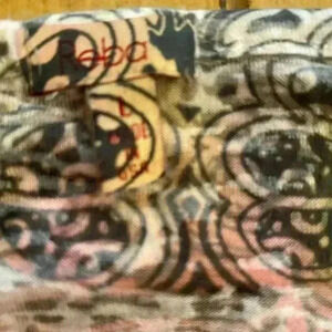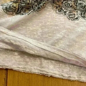 This is such a pretty and artistic looking Reba long sleeve top. It is marked a size large and it is stretchy. Depending on how tight you like things fitted, I will list in under both a medium, and a large. I have the measurements in the pictures .The bodice of the top has the beautiful decor and design and some rhinestones. The bottom trim is lace, which has had some wear and I show that in the pictures. It is a thin top but not very see-through. Please let me know if you have any questions and thank you for considering my item.🌻