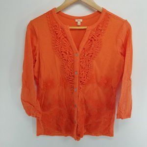 Reba orange embroidered netting stud button up shirt size S