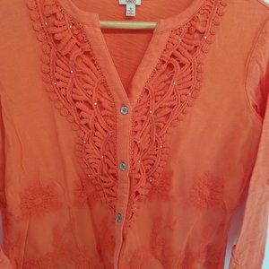 Reba orange embroidered netting stud button up shirt size S. This has been washed once and never worn,