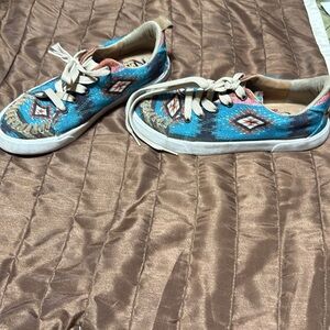 Reba by Justin Vibrant sneakers with a unique pattern. Features blue, red, and tan colors. Perfect for casual wear.