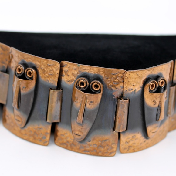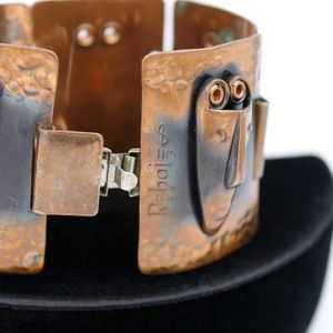 This stunning copper bracelet is the work of Frank Rebajes, the Dominican-born artist who lived and worked in the U.S. from the 1930s - 1950s. His jewelry represents some of the finest in modernist design, and is popular with collectors. The design here is known as "Brazilian Masks." The bracelet measures about 6 1/2" including hardware x 1 5/8" wide. It is signed "Rebajes" on the left-most panel.