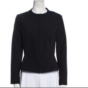This classic jacket has clean finishes with a zip front and collarless neckline, and a feminine shape created by a small peplum.
