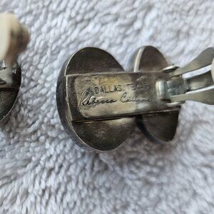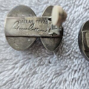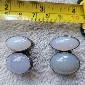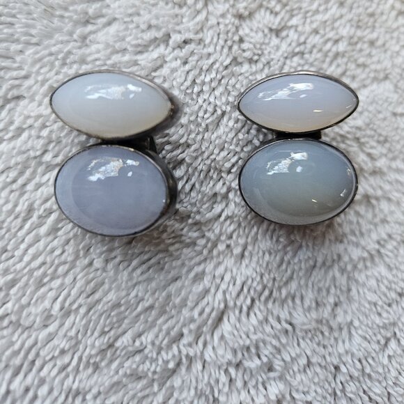 Rebecca Collins' jewelry is ultimate rich-girl chic, all of them subtle statement and unmistakable pieces. This pair of clip-on earrings is, as I recall, blue chalcedony, that wonderful cloudy blue stone that even the uber-stylish Duchess of Windsor chose for some of her spectacular jewels. A marquise shape mounted above an oval, each measures a bit more than one inch high. See photos for precise measurements. mounted on sterling silver signed with Collins' signature and "Dallas, Texas." I bought all of my Collins pieces at Neiman-Marcus before 2009, when she stopped selling her line. Original price about $500. Your questions welcomed.