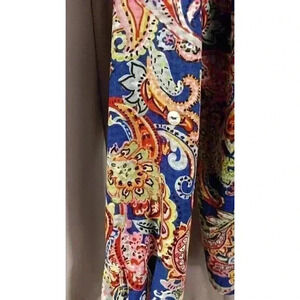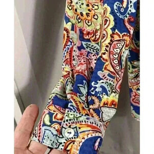 This Rebecca Malone button-up shirt is a great addition to any casual wardrobe. The shirt features a collared neckline, button closure, and long roll tab sleeves. The fabric is made of easy-care polyester with a paisley pattern in vibrant colors. The shirt is perfect for summer, fall, and spring seasons and has a regular fit. It is machine washable and has no vintage or personalized features. The shirt is suitable for women's regular size and is not handmade. The shirt is made in India and has a flower theme.