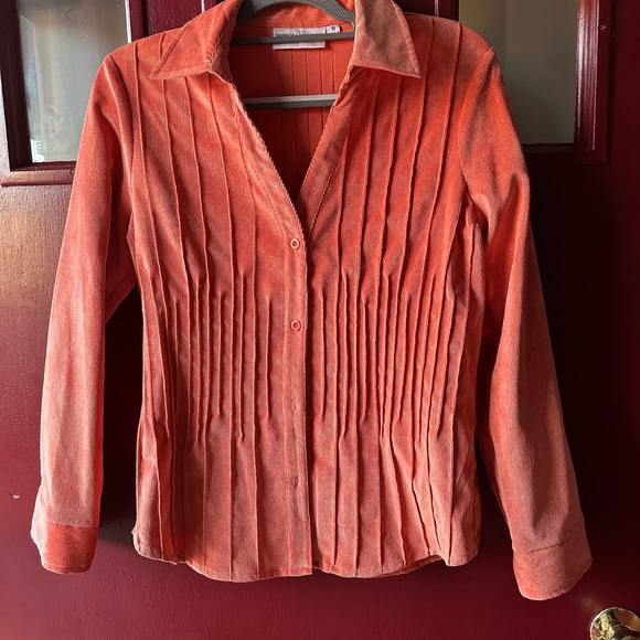 Elegant coral button-down shirt with pleated design. Ideal for both work and casual wear.