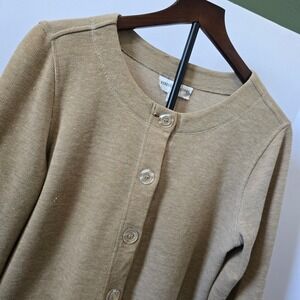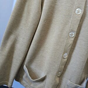 Keywords: Rebecca Malone, knit cardigan, sweater, button front, pockets, tan cardigan, neutral sweater, womens cardigan, small, S, long sleeve, casual cardigan, round neck, classic cardigan